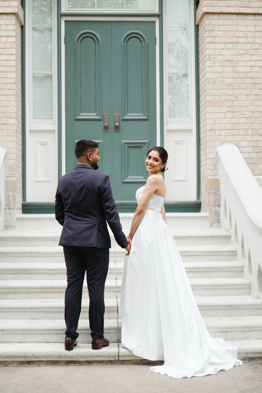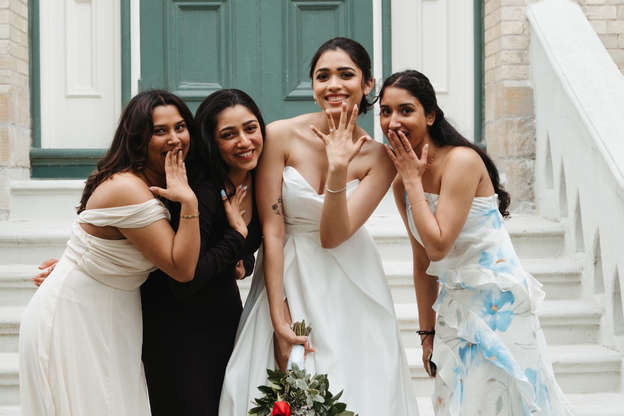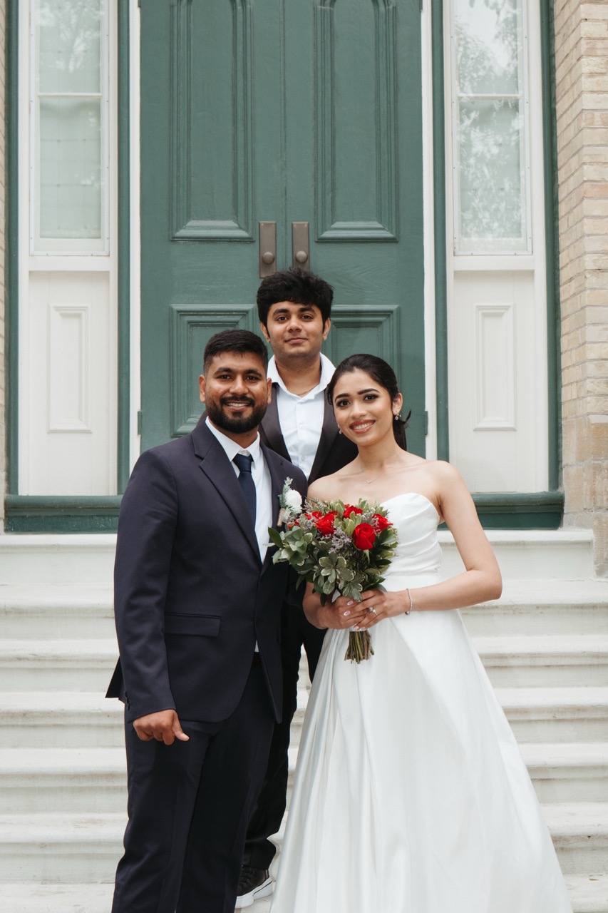 It was a very intimate civil ceremony. We started by capturing the ceremony, then took the couple to a gorgeous staircase with timeless green doors. We did a quick e-shoot there, along with family portraits and a few fun shots with friends.