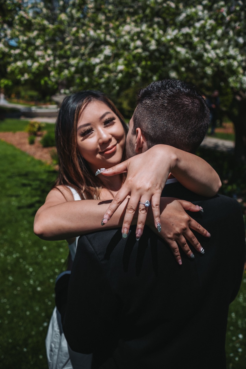 We always like to play with different angles so each set has a different look. That’s exactly what we did for these Guild Park engagement photos. We even laid in the grass and shot from underneath their hands so we could frame the spring blossoms in the trees above.