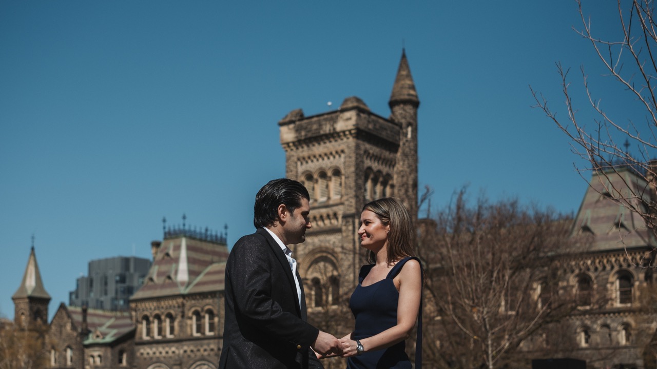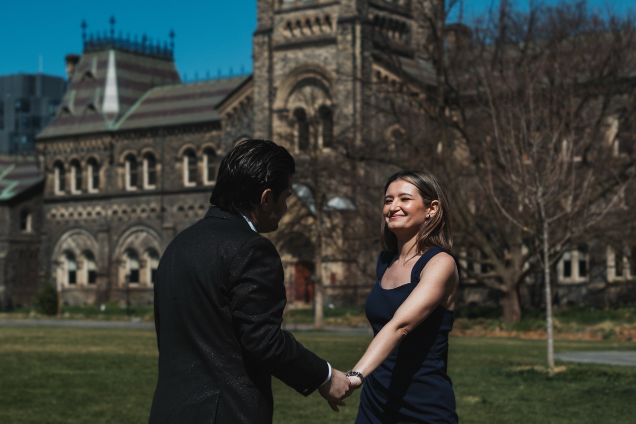 He wanted timeless photos with the architecture because this is where they first met. He also wanted to include the ROM, but since we always research locations ahead of time, we found out it was under construction. We adjusted the plan and kept the shoot focused on spots that matched the look he wanted.